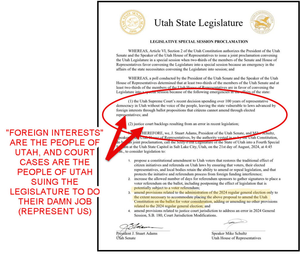 This year, a coalition of Utah GOP legislators were checked by the Utah Supreme Court for failing to represent Utah citizens, and now they are actively writing legislation to strip our rights away. They don’t like being checked by the courts, by the executive branch (although our current governor coddles to the legislature) or by us, the people. In their proclamation for the special session they warn about foreign interests. ONLY UTAH VOTERS can submit a Citizen Initiative. They are literally calling the interests of Utah voters “foreign interests”. Are you mad yet? You should be.