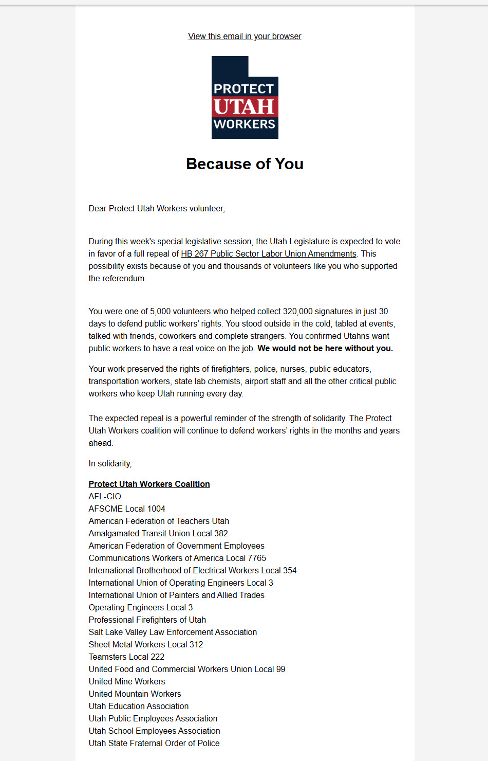 The Protect Utah Workers Coalition sent out the following email declaring a tentative victory, but only if the Utah Legislature votes for a full repeal of HB267 in a special session starting December 9.